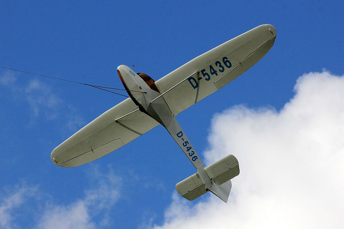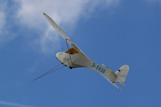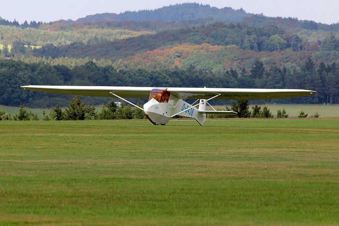 Bei dem Doppelraab handelt es sich um eine der ersten deutschen Neukonstruktionen nach dem zweiten Weltkrieg. Mit diesem Flugzeugtyp begannen viele Segelflugvereine, als 1951 die Segelfliegerei wieder erlaubt wurde. Der einfach konstruierte Doppelsitzer konnte problemlos durch Fliegergruppen nachgebaut werden. Eine Besonderheit ist, dass der Fluglehrer erhöht hinter dem Flugschüler sitzt und sich mit diesem einen Steuerknüppel teilt. Der hier vorgeführte Doppelraab IV wurde einst durch den einstigen Luftsportverein Vorgebirge gebaut und feierte unlängst das 70-jährige Jubiläum seines Erstflugs. Albert Schaden, der heutige Besitzer des "Mösch" genannten Doppelraabs, hat als Kind den Bau, an dem sein Vater beteiligt war, mitverfolgt. Das Flugzeug ist heute in Bonn-Hangelar beheimatet und immer wieder gern gesehener Gast auf unserem Flugplatz.