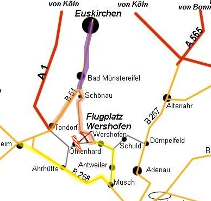 Aufgrund einer Straßensperrung in der Ortsdurchfahrt von Ohlenhard, unmittelbar westlich unseres Flugplatzes ist der direkte Weg von der Autobahn zur Zeit versperrt. Es gibt leider keine örtliche Umleitung. Auch in der Ortslage von Tondorf gibt es eine Sperrung, so dass auch der nächstliegende Weg nicht genutzt werden kann. Von der A1 aus nimmt man daher am besten die Autobahnabfahrt Mechernich und fährt dann über Bad Münstereifel - Schönau - Hümmel nach Wershofen. Über Tondorf - Holzmühlheim - Schönau - Hümmel führt der beste Weg vom Autobahnende der A1 bei Blankenheim. Die ausgeschilderte Umleitung geht über Ahrhütte - Müsch - Antweiler - Wershofen. Die Zufahrt zum Flugplatz aus Richtung Osten ist frei. Wir empfehlen euch, nach Google Maps oder ähnlichen Navigationsgeräten mit aktuellen Informationen zu Straßensperrungen zu fahren.